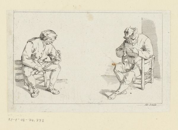 Curator: Coryn Boel's small etching, "Monkey Singing, Accompanied on the Lute by Another Monkey," presents a peculiar scene. I'm struck by how refined the etching itself appears— almost delicate. Editor: It's curious how the artist chose to represent monkeys engaged in such human activity, surrounded by musical scores and drinkware. Is there a deeper meaning here? Curator: Indeed. Monkey imagery in art has often been used to symbolize folly or mimicry, reflecting on human behavior. The presence of music and drink suggests a satirical commentary on indulgence or perhaps the transience of pleasure. Editor: I'm interested in the materiality of the print itself. The fine lines and detailed cross-hatching must have required significant skill and precision on the copper plate. Curator: Precisely! It's worth considering the cultural memory embedded in the use of animal allegories. These monkeys resonate with a tradition of critiquing society through symbolic imagery. Editor: I suppose these monkeys invite us to reflect on our own follies, and the materials invite us to look closer at craft. Curator: A poignant reminder, indeed.