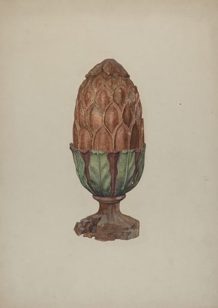 Curator: I’m immediately struck by the rustic charm of this piece. The drawing's muted colors give it a certain antiquated air, almost as if unearthed from a forgotten storybook. Editor: It is indeed quaint. Let’s delve deeper. We have here "Pa. German Squirrel Figure," created by A. Maralian, dating roughly from 1935 to 1942. It employs watercolor, charcoal drawing, and colored pencil. What visual pathways can we trace? Curator: Well, squirrels are potent symbols. They represent industriousness, preparedness, and the gathering of resources. But the somewhat stiff posture and presentation of the creature evokes folk-art traditions, a connection to simpler, agrarian lifestyles where animals often held a near-mythical significance. Editor: I concur, yet, notice how Maralian's line quality emphasizes contour and volume. The textures, especially the quasi-geometric rendition of the tail and fur markings, give the subject more solidity. This tension between surface and depth makes me see both its artistic presence and its potential for allegorical messaging. Curator: Exactly! The formal elements enhance the cultural memory embedded in such imagery. In Pennsylvania German traditions, for example, natural motifs intertwined heavily with spiritual beliefs. The squirrel holding what looks like an acorn, further signifies a bounty, good fortune, or providence, particularly relevant perhaps, given the era in which this work was created. Editor: The tonal variations, especially in the shadowed underbelly, do introduce depth—a kind of chiaroscuro that contrasts with the relatively flat backdrop. The piece almost pulls itself out of the page. Curator: Perhaps that emergence represents something deeper; a connection between the familiar and the transcendent. This isn’t merely a depiction of a squirrel—it is an echo of values passed down through generations. Editor: Well said. It gives food for thought, a dialogue between our eyes and ancestral knowledge. Curator: Indeed, and I hope listeners found their own symbolic path in our analysis as well!