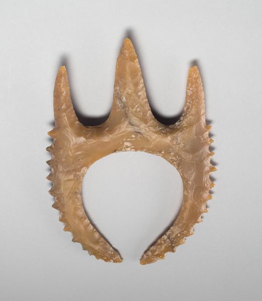 Curator: The Art Institute of Chicago holds this compelling necklace from around 200 CE. It's a Colima piece depicting a large fish consuming a smaller one. Editor: Immediately, I’m struck by its tactile nature. You can almost feel the smooth worn texture of the material. There is something inherently unsettling but also intriguing about it. Curator: Absolutely. Colima art frequently explored themes of transformation and power dynamics. The image of a large fish devouring a smaller one could represent societal hierarchies or even spiritual beliefs about life cycles, life, death, and rebirth. Consider the potential symbolic weight attached to adornment in these cultures. Editor: Given its composition, it would be intriguing to examine the source and the working of the materials—perhaps some kind of shell or even wood—as a statement about the Colima community’s connection with the water or with more earthly matter. Did the craftsman shape the pendant only with primitive tools? What about the necklace beads? These choices inevitably influence the artwork's significance. Curator: Precisely. The carving could signify specific techniques used within their community. Its production methods highlight the social and cultural aspects of Colima life. Perhaps gendered craftmanship norms are implicated. We also must consider whether those who would have worn it—as with most other art objects—may have experienced significantly different interpretations. Editor: Yes, considering the access to these kinds of precious raw materials, as well as their processing in a society that, according to scholars, lacked complex metal tools—it's interesting to consider production through collective efforts. Curator: Indeed. Thinking about the historical implications, the "big fish eats little fish" trope is hardly unique to Colima culture, which also invites analysis through a postcolonial lens, prompting reflection on cultural imperialism throughout time. Editor: By situating this piece within a network of labor and material history, the necklace pushes beyond the aesthetic into discussions of materiality and cultural value, don't you think? Curator: I completely agree. Hopefully this small fish is at least rich in these concepts now! Editor: It surely is!