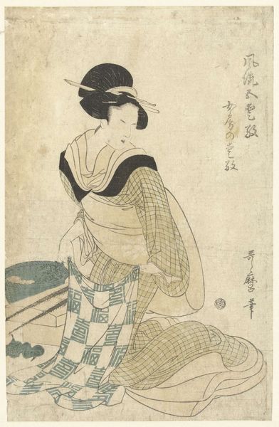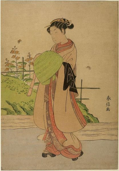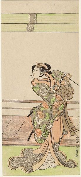 Editor: This is "Man Standing in High Wind" by Katsukawa Shunko. The artist uses woodblock print on paper, and I’m struck by the composition. The diagonal lines create a sense of movement and tension. What do you see in this piece? Curator: The composition is indeed dynamic. The figure's posture, the billowing fabric, and the angle of the fan all contribute to this sense of instability. Note how the artist utilizes a limited palette, creating a visual harmony, yet with subtle contrasts that direct the eye. Editor: So, the formal elements are really working to convey that feeling of being caught in the wind? Curator: Precisely. The artist manipulates line, form, and color to communicate not just a literal scene but a feeling, an experience of nature's power. It's about the formal arrangement as a means of expressing content. Editor: That is fascinating. I'll definitely look at prints differently now. Curator: Indeed, a study of formal qualities can unveil the deeper meaning.