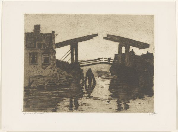 Henri-Charles Guérard created "La drague de Dieppe," a print that captures a night scene with a dredging boat in the foreground. The composition is dominated by the boat's dark, geometric shapes against the shimmering water. The limited tonal range evokes a melancholic mood, emphasizing the industrial elements of the scene. Guérard uses the contrast between the solid structure of the boat and the fluid reflections in the water to explore themes of industry and nature. The stark lines of the machinery against the soft, diffused light suggest a dialogue between the man-made and the natural world. The semiotic interplay here reveals how industrial progress encroaches upon and transforms the environment. Ultimately, the aesthetic tension between the rigid forms and the ethereal light invites ongoing interpretation about humanity’s impact on the landscape and challenges fixed notions of progress and harmony.