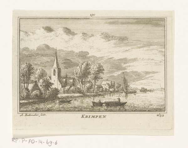 Editor: So, here we have Abraham Rademaker's "Gezicht op Capelle aan den IJssel, 1632", an etching created sometime between 1725 and 1803. It depicts a calm day in a small riverside community, almost idyllic. What stands out to you about it? Curator: Well, focusing on the material aspects, the printmaking process itself is key. Etching allowed for the mass production of these images. What were the economic conditions that allowed artists such as Rademaker to produce cityscapes that would be of value to ordinary people? Consider that this wasn’t a one-off painting intended for a wealthy patron. Editor: That's interesting. So, who would have been buying these etchings? Curator: Probably the emerging merchant class and middle class seeking affordable art to decorate their homes or document their surroundings. This print offered access to landscapes and scenes of everyday life at a lower price point. Consider what that availability did for art appreciation. How did this reproductive method blur lines between art and commodity? Editor: So it's not just a picture of a place; it's about accessibility and consumer culture. Does the choice of the subject matter – Capelle – also factor into this materialist reading? Curator: Absolutely. These prints were designed to portray the environment in which these new art buyers and patrons lived and made a living, providing familiar context they valued. To extend our line of thought, what resources and materials might be important for this particular etching besides the ink and paper? Editor: Perhaps the etcher’s tools themselves? And the infrastructure needed to distribute and sell the prints? It shifts the focus from the aesthetic value of the artwork to its material conditions. Curator: Precisely. It allows us to explore the world in which Rademaker was functioning, including the role of craftsmanship and industry in shaping artistic production and the consumer market of the time. It urges us to recognize value in production and understand art consumption beyond aesthetics. Editor: I'll never look at an etching the same way again.