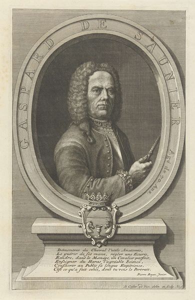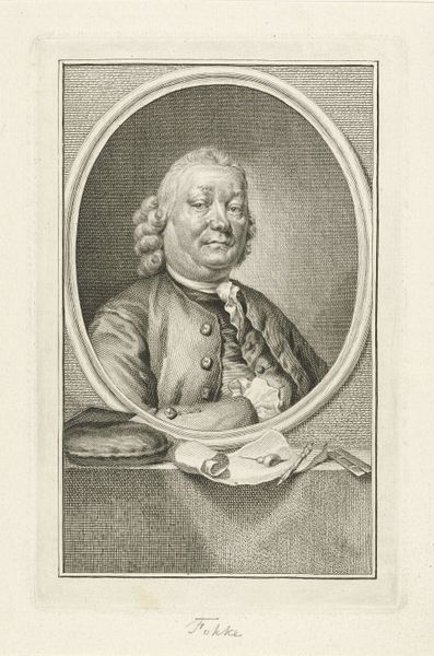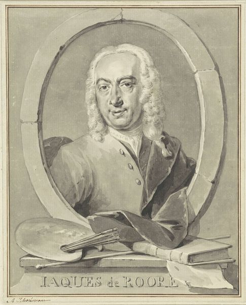 Curator: This is a print of Jean Baptiste Oudry, made by his wife, Marie Marguerite Oudry. The etching and engraving give a formality to the presentation of the tools beneath the portrait. Editor: The overall impression is quite intimate, though. The guitar, the scattered papers with music... it all feels very personal. Curator: Consider that the print medium itself suggests a wider distribution and, therefore, a wider appreciation of Oudry's work. The labor of reproduction, transforming painting to print, becomes a form of cultural promotion. Editor: The guitar seems symbolic, perhaps of harmony or even the muse of music. The way it's nestled with the books suggests a connection between the arts. Curator: And indeed, it's her labor, her skill in reproducing his image and artistic context, that spreads Oudry's fame. Editor: It's a lovely tribute, a testament to their personal and professional lives. Curator: A lovely glimpse into the labor of artistic partnership.