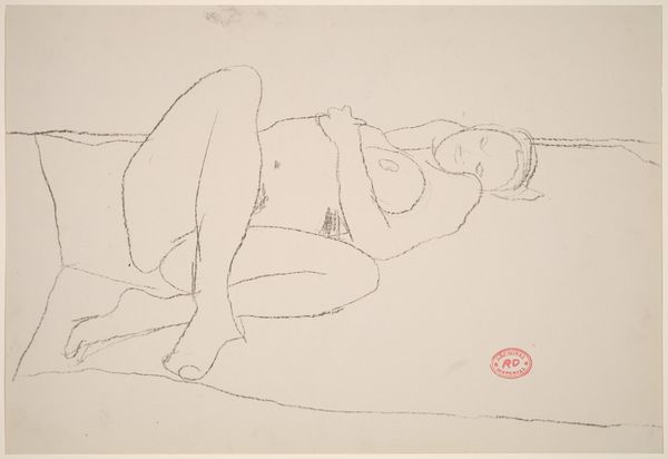 Curator: Well, here we have Richard Diebenkorn's "Untitled [reclining woman resting on right arm]", a pencil drawing, likely created sometime between 1955 and 1967. It’s just... raw, wouldn't you say? Editor: Yes, and it’s giving me major "afternoon slump" vibes. She looks completely unbothered, like she's fully surrendered to the weight of existence. Is it modern ennui distilled into a pencil sketch? Curator: Perhaps. It strikes me how economical Diebenkorn's lines are here. With a kind of airy confidence, it's just the faintest gesture toward form and shape. It is a finished drawing, or is it an ephemeral thing, existing halfway to something else? Editor: Exactly! I see it more as an exploration of form rather than a definitive statement. It feels intimate. Like we're peering into Diebenkorn’s sketchbook and seeing the genesis of a future painting perhaps. Think about the post-war environment, that generation’s push against definition... it speaks to that, I think. Curator: It is definitely tempting to see this through the lens of the social changes. Still, as a drawing, I find it wonderfully unresolved. Those almost cartoonish flower shapes beneath the figure... Are they comforting? Do they offset the figure's own exhaustion, her vulnerability? Editor: The flowers add to that sense of intimacy, as if she's in a private world, oblivious to our gaze and certainly free of ours. Curator: There’s something quietly radical in its simplicity, in the confidence it takes to leave so much unsaid. The sparseness is key. If the image were rendered with a little bit more detail, if the forms were shaded or smoothed, that feeling of intimacy would be dispelled, that sense of capturing a private moment would be lost. Editor: I agree. It is a delicate balance, like walking a tightrope between abstraction and representation, and daring us to see the world with the same openness that the artist sees it. Curator: Well put. Ultimately, this small sketch offers a great view into Diebenkorn's evolving approach. Editor: Indeed. And hopefully prompts viewers to reconsider their expectations of "finish" and the power of suggestion in art.