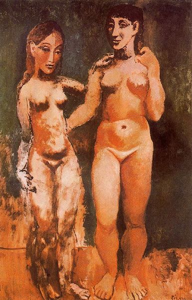 Curator: Here we have Pablo Picasso's "Two Nude Women," a drawing created in 1920, a fascinating work that reflects Picasso's exploration of the female form and the shifting artistic currents of the time. Editor: There’s a muted melancholy in this composition; the hues feel aged, the lines both softened and harshly defined, and these figures appear weary, contemplative. Curator: Exactly, and situating this pastel within its era reveals Picasso grappling with the post-World War I cultural landscape. He returned to classical forms, a phenomenon mirrored by many artists seeking stability after immense upheaval. The nude, then, wasn't simply an aesthetic choice but a symbolic return to humanism, perhaps even a quiet rebellion against pre-war avant-gardism. Editor: Yes, the figures almost harken back to archaic statues. Note, however, how Picasso employs a somewhat disjointed realism. There's a tenderness here, almost a motherly quality between the women, but the disrupted proportions—especially in the limbs and facial features—give it a strange, unsettling tone. Are they icons of comfort, or is there a subtle discomfort, a societal fracture, conveyed through the rendering of these intertwined women? Curator: Precisely. Picasso blends classical ideals with nascent Cubist elements, suggesting the multifaceted nature of identity. Are we seeing representations of a singular woman in multiple temporal states? Is it perhaps an argument of gender in this time? Editor: Their vulnerability is emphasized by the soft pastel medium and the embrace feels simultaneously intimate and detached, the pale shroud-like drapery hinting towards mourning perhaps. What strikes me is the enduring visual potency—these archetypes reverberate even now, a mirror reflecting both historical anxieties and intimate connection. Curator: Indeed. And the exploration of these complex layers underscores the potent dialogue possible between historical context and art as social and emotional expression. Editor: Looking closely at "Two Nude Women," we encounter an experience which feels strikingly timeless. Curator: Agreed; it is not merely a study of the human form, but rather, the study of human identity and collective consciousness.