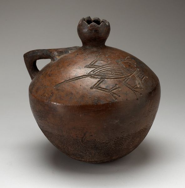 Editor: Here we have a "Double Spout Vessel with Incised and Painted Abstract Feline Head," dating back to around 650 from the Paracas culture. It's ceramic, with a lovely rounded shape and design. It's incredible to think about how the materials reflect the land around them. What’s particularly striking to you about this vessel? Curator: The double spout vessel exemplifies Paracas engagement with ceramic technology. The work departs from a simple utilitarian use of ceramic; it’s an integration of labor, symbolism, and material exploration. Look at the refined smoothness—how does that elevate or redefine "craft" in relation to "art"? Editor: It's interesting you mention the "craft" aspect of it. The incised and painted decorations almost seem secondary to the form. Curator: Precisely. Think about the entire process - the clay, the firing, the pigments used for decoration. Each decision highlights resources. The feline motif, abstracted and geometric, points to an engagement with nature itself as a material source, right? Editor: Absolutely, and the time and care dedicated to its production implies a social importance beyond just a vessel. What was its function, then? Curator: Its function goes far beyond simple storage or transport. Consider how its creation and use could have bolstered communal identity. How might these material choices--the feline iconography, the ceramic itself-- reinforced social hierarchies or spiritual beliefs within the Paracas community? It pushes us to rethink definitions of luxury. Editor: So it's about viewing art, and this vessel specifically, as fundamentally connected to social structure and how the materials impacted ancient society. Curator: Exactly! This vessel reveals the tangible connection between artistic production, the physical environment, and the belief system, and asks us to think critically about consumption habits tied to our modern understanding of luxury items. Editor: It really broadens our understanding of art history when you look at the cultural context and the act of making itself. Curator: It sure does; examining the materials can change how we interpret its meaning, then and now.