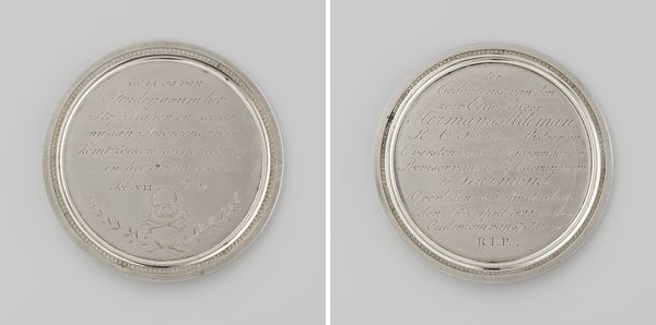 Editor: This is an interesting piece! It's a metal medal from 1825. It was given by the "Genootschap ter Beschaving van de minvermogende Stand" to someone named L. Kroll. The inscription makes it feel very formal, almost austere. What's your take on it? Curator: This medal offers us a glimpse into the social dynamics of the 19th century. These societies, often operating with philanthropic intentions, also wielded power in shaping societal norms and expectations. Who were the "minvermogende Stand"— the 'lower classes'? And what did "beschaving," or civilization, really mean in that context? Editor: So, it's not just about helping people? Curator: It's more complicated than that. This medal represents a top-down approach to social reform. What implications did these reform movements have on individual agency and cultural expression among those being "civilized"? Editor: That makes sense. So the medal, beyond being an object of recognition, embodies a whole system of social control? Curator: Precisely! Look closely at the text; language carries so much weight, doesn't it? How might the recipient, L. Kroll, have viewed this 'honor'? Did it feel empowering, or perhaps, subtly diminishing? Think about how these kinds of rewards can simultaneously uplift and reinforce existing power structures. Editor: Wow, I didn't see it that way initially. Now, looking at it, the medal feels less like a simple token of appreciation and more like a complex symbol of social engineering. Curator: Exactly. Art objects often operate on multiple levels, reflecting and shaping the ideologies of their time. Considering the medal in light of today’s debates around social justice, can it contribute to understanding the historical roots of inequality?