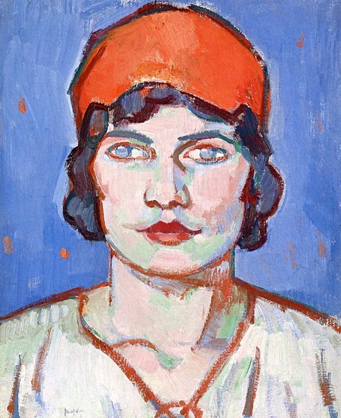 Curator: This is Henri Matisse’s “Marguerite in a Leather Hat,” painted in 1914. It’s oil on canvas and a fascinating example of his Fauvist approach to portraiture. Editor: My initial reaction is the boldness of the color palette. The juxtaposition of blues, oranges, and that soft yellow is strikingly modern. The starkness of the planes on the sitter's face is compelling. Curator: It's interesting you say "stark." During this period, Matisse was deeply influenced by Cubism and the need to analyze form in new ways. However, let’s also think about 1914, as war was brewing and society was tense. Could this portrait reflect that through this emphasis on a flattened visual space? Editor: I absolutely see the possibility for societal unease reflecting onto this work. Thinking about the representation of women at this time – a move from traditional ideals toward greater visibility – I also wonder if the portrait challenges the conventional passive role of women through its assertive brushstrokes. Curator: Exactly! The Fauvist color choices, considered “wild” at the time, become an assertion of a modern female identity. This painting rejects conservative tastes and suggests the woman being represented refuses such limitations. The hat, while seemingly fashionable, almost becomes armor. Editor: I’m particularly drawn to her gaze. It’s so direct. This piece also reminds me how the art world has frequently treated and sidelined female artists. A portrait such as this by a male artist attains prestige far faster than portraits of a similar calibre painted by women of that time. It emphasizes those art historical dynamics, of how the market celebrates certain voices. Curator: It makes us ponder whose perspectives are memorialized. If Matisse’s rendering makes her timeless, there is a history of similarly strong women being painted *by* women but their work fading into obscurity or being misattributed. It reinforces the crucial need to interrogate canon formation constantly. Editor: Yes, this portrait serves as a reminder: while we can appreciate the aesthetics and context, we must question the narratives constructed around it and who benefits from that construction. It forces us to keep looking. Curator: It's important to look with criticality but with curiosity. We are invited to ponder, even question the very structures behind this artwork, not just the artwork itself.