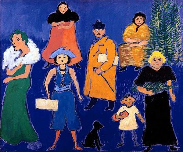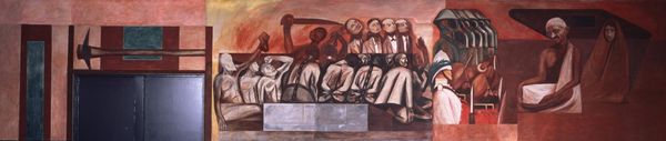 Curator: This is Natalia Goncharova's "Peasants Dancing," painted in 1911. It's an oil on canvas, showcasing a group of figures engaged in what appears to be a folk dance. Editor: Right off the bat, the painting feels heavy, almost melancholic. The dark background really emphasizes the solidity of the figures. Is it just me, or does their joy feel…muted? Curator: That perceived heaviness stems from the artist's treatment of form and color. Note how Goncharova simplifies the figures into almost geometric shapes, bordered with dark outlines. This, coupled with the somber palette, indeed contributes to that feeling. Editor: I get it, like she’s building forms not just representing them. The dark outlines and earthy colors make it almost like a mosaic… but a gloomy one! Even the bright orange feels dense. I wonder what's going on in their world beyond this dance. Curator: While stylistically expressionistic and leaning towards the Russian avant-garde, we must remember that Goncharova also delved into Russian folk art for inspiration. This blending is essential. Editor: So you think she is intentionally evoking something beyond just pure form and color? Because to me, the awkward angles and kind of frozen expressions aren't traditionally beautiful at all, even the dark colors contribute to an uncomfortable feeling, not some happy folk dance. Curator: I would argue that she aimed not for traditional beauty but something more profound. Her use of reverse perspective challenges Western notions of realistic space. Instead she creates an environment that allows us to contemplate on something else. Editor: Ah, the rebellious spirit! I like that. And now the dark mood clicks a little better – she is making us work for joy and beauty, challenging our comfort, like life itself maybe? Curator: Precisely! It transcends a simple genre scene. By combining traditional subject matter with avant-garde techniques, Goncharova is inviting the viewer to consider tradition and modernity. Editor: A thoughtful painting disguised as a folk dance… It’s interesting to know the painting is rooted in a period of social change; maybe a painting with this depth could spark change in peoples heads? Curator: Yes, understanding Goncharova's approach certainly deepens one's appreciation. I am really interested in these colors, even in the somber dark background, she puts the lights and it's the lights that create this dance. Editor: Definitely! Thanks for the context; I think now I understand its mood, it is as simple as being "Peasants dancing" but also way beyond that.