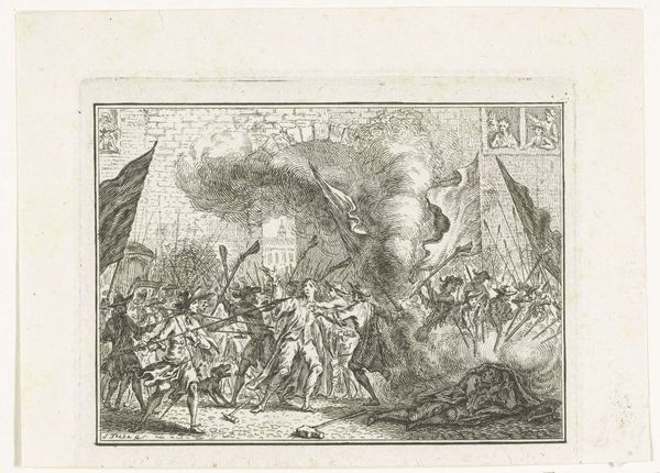Curator: Simon Fokke created this engraving, entitled "Inname van Den Briel, 1572," sometime between 1756 and 1758. It’s currently held in the Rijksmuseum. Editor: It has a gritty feel, a landscape of fine, etched lines. The smoke plumes billowing from the burning buildings add such drama and energy to a seemingly simple scene. Curator: Exactly. The piece depicts the capture of Brielle by the Watergeuzen, the Sea Beggars, in 1572. This event is highly symbolic in Dutch history. It represents the spark that ignited the Dutch revolt against Spanish rule. See how the artist uses the central flag as a beacon of resistance and change? Editor: Absolutely. And you know, the texture created by the engraving technique emphasizes the labor involved—not just in the historical event, dragging that heavy cannon, but also the meticulous work required to produce the print itself. Think about the engraver, Fokke, painstakingly carving each line into the plate, a real act of dedication! Curator: He's definitely drawing on established visual rhetoric. Consider the figures; even in their relatively small scale, they possess a clear dynamism. Their postures, the way they strain while moving the cannon… Fokke clearly intends for the viewer to feel the effort, to emotionally align with their struggle for liberation. Editor: And the material conditions shaped that representation, right? Engravings like these circulated widely. It became a potent medium to broadcast and shape collective memories of pivotal events. Prints were comparatively cheap, available, and the means to disseminate this imagery. Curator: And the symbolism layered within such readily available artwork reinforced a burgeoning national identity. Brielle wasn't just a city taken, but an ideal of freedom being established through this bold action. The fire could symbolize destruction but also the purification or cleansing of oppressive elements. Editor: Yes, precisely. This engraving illuminates both the historical event and the labor invested to make such imagery accessible to wider audiences. Curator: A confluence of history and hard work that solidified ideals! Editor: Agreed. It's compelling how the physical print connects the symbolic weight of the event.