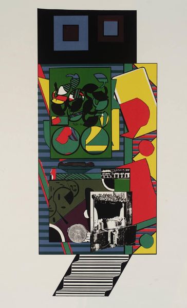 Curator: Eduardo Paolozzi, a titan of British Pop Art born in 1924, challenges us with this screenprint, "Conjectures to Identity," now residing in the Tate Collections. Editor: My first impression is organized chaos. A barrage of colors and mechanical fragments that somehow…work. Curator: Paolozzi often explored technology and the human form, reflecting on post-war anxieties and fascinations. The title itself hints at fragmented identities within a machine age. Editor: Absolutely, I see reflections of mass media and consumer culture mashed into one image. It feels both futuristic and nostalgic. Curator: These layered images seem to question how we construct our sense of self amidst all this information and rapid change. Editor: It's quite unsettling how such disparate images can create a cohesive whole, like the bizarre poetry of modern life. Curator: Paolozzi saw beauty in the mechanical, a new kind of organic form, and he asks us to consider what that might mean. Editor: A question we are still navigating in this digital age. It's a bit of a mind-bender, a glimpse into the artist's own identity, perhaps?