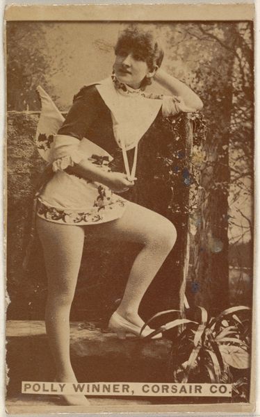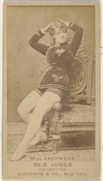 This is a promotional card for Cross Cut Cigarettes, part of a series featuring actors and actresses, created around the turn of the century by W. Duke, Sons & Co. Note how Jennie McNulty’s confident pose, hands on hips, and direct gaze embody the spirit of the era's performers. This stance echoes poses found in classical sculpture, a subtle nod to ideals of beauty and strength. Consider how the assertive posture of the figure—a gesture of self-assuredness—reappears throughout art history, from ancient goddesses to modern-day icons. Observe the ornament on the pillar behind her, topped with a cupid-like figure, which has, since antiquity, been associated with beauty and love. What we find interesting here is how it has become a symbol of both divine and earthly love, often seen in funerary art, or as a symbol of profane love in paintings like Titian's *Venus with an Organist*. The cyclical nature of these motifs demonstrates how symbols are never truly static. They are continuously reinterpreted, reflecting evolving cultural values and desires.