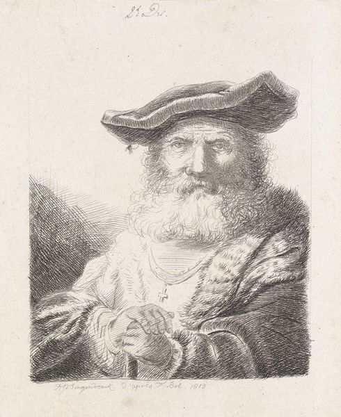 This is Antoine Marie Labouchere's 'Portret van een rabbi,' an etching on paper. The etching process involves covering a metal plate with a waxy, acid-resistant ground. The artist then scratches an image into the ground, exposing the metal. The plate is submerged in acid, which bites into the exposed lines, creating grooves. Ink is applied to the plate, filling the etched lines, and the surface is wiped clean. Finally, the plate is pressed onto paper, transferring the image. The network of fine lines that describe the Rabbi's face, beard, and clothing speak to the labor involved in the etching. It suggests a level of detail and control that's rarely seen outside of traditional fine art. The social context of printmaking allows for the wider distribution of images, democratizing art and ideas beyond elite circles. The value of this work lies in the combination of skilled handwork and mechanical reproduction, blurring boundaries between art, craft, labor, and commerce.