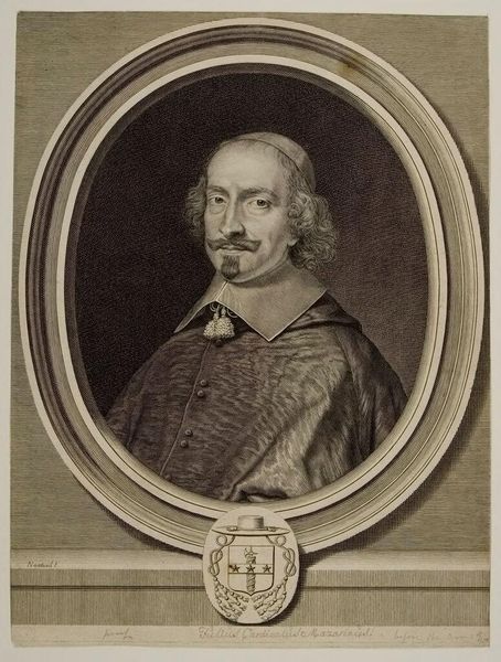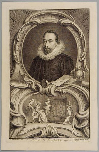 Curator: This portrait of Cornelis Frans Eversdyk, engraved by Jacobus Houbraken, presents a fascinating study in tonal gradations and structural composition. The oval frame, set within a rectangular architectural surround, creates a dynamic interplay of forms. Editor: It definitely has a formal feel. What strikes you most about the structure of this piece? Curator: The careful balance between the textures—the smoothness of the face, the fur collar, and the intricate hatching of the background—demonstrates a mastery of the engraving technique. Note how the artist utilizes the oval frame, and geometric elements within the architectural frame, contrasting organic form with geometric shapes. Editor: So, it's the careful arrangement of these formal elements that makes the work so compelling? Curator: Precisely. The work invites us to appreciate the skill and artistry inherent in the medium itself. Editor: I see now. It's not just a portrait, but a demonstration of form. Thanks!