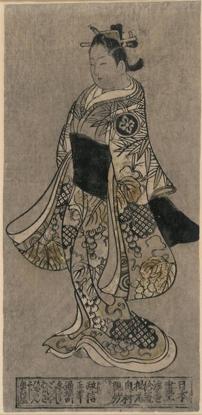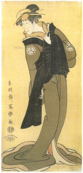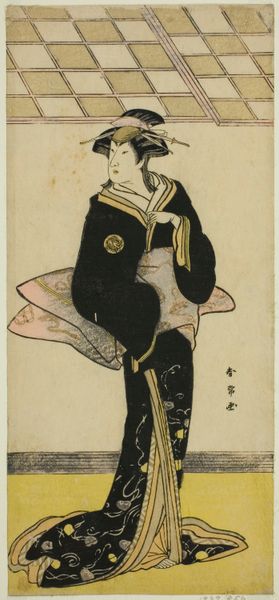 Curator: Welcome. Here we see "Sanokawa Ichimatsu III as Sekinoto, wife of Fuwa Benzaemon," a striking woodblock print created by Tōshūsai Sharaku in 1794. Editor: The monochrome aesthetic lends a gravitas that the details fight against. I can't quite tell what kind of story this portrait is trying to tell! Curator: The artist, Sharaku, produced prints for only about ten months. But in that time, he focused on portraying kabuki actors, often in roles that subverted traditional expectations. Notice the repetition of the design printed on the kimono sleeves. Editor: You’re right to point that out. There is a fascinating duality here; on the one hand, you have the overt, surface-level image of status, power, even luxury signaled by the complex fabrics—the production of these objects required skilled labor and specialized resources. Yet there is something very sad in this figure's posture. The downturned glance seems laden with hidden meaning. Curator: It's essential to recognize how the Ukiyo-e tradition, although depicting the floating world, was grounded in the socioeconomic realities of Edo-period Japan. Sharaku’s focus on capturing likeness – sometimes unflatteringly so – disrupted the norms of idealized beauty. And note how the background itself isn't pristine. We see a bit of the raw material itself, not hidden from view. Editor: Absolutely. Kabuki itself was a space for challenging social hierarchies. These actors—often from marginalized communities—gained immense popularity and challenged the established order through performance. So, how might this particular portrayal reflect Sharaku’s and perhaps the audience’s perspective on gender roles, on women’s social positions at the time? Does the wife of Fuwa Benzaemon even have the agency to challenge expectations, or is her representation solely defined by male expectation? Curator: We should also think about distribution and consumption of these prints. They were produced relatively quickly and sold to a broad urban audience. Think of the artisans, the printers, and publishers involved, creating a visual language available across different social classes. Editor: It makes me think about access—who gets to be represented, how, and why? This artwork really allows us to grapple with the tensions between individual expression and broader social and political narratives, doesn't it? Curator: Indeed. It is a testament to how deeply intertwined artistic expression is with material conditions and social commentary. Editor: Right. Sharaku provides just a small, compelling window into a world we must view with our own contemporary analysis.