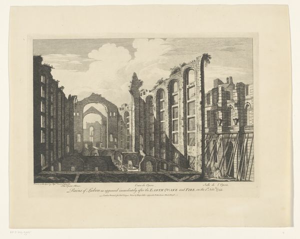 Editor: This etching by Girolamo Rossi, made around 1756-1757, is titled "Graftombe van de vrijgelatenen en slaafgemaakten van de familie van Augustus"—which translates to "Tomb of the freedmen and enslaved people of the family of Augustus". It's quite imposing, even a bit eerie. What do you see in this piece? Curator: Immediately, the geometric patterns and the sheer number of niches strike me. The repetitive architecture could signify the structured, hierarchical nature of Roman society, even in death. These small spaces, designed for the remains of individuals formerly bound to servitude, become potent symbols. Editor: So, the tomb itself becomes a commentary? Curator: Precisely. Think of the collective memory embedded in this place. The individual identities of those interred are somewhat obscured, yet their presence en masse speaks volumes about Roman social structures and the role of slavery and freedom within them. Consider how architecture is often employed as a mnemonic device – a physical manifestation of cultural memory. Editor: That's fascinating. Are there other symbolic clues you notice? Curator: The state of disrepair, perhaps? The overgrown foliage suggests the erosion of power, the inevitable decay of even the most formidable empires. The figures interspersed amongst the architecture also suggest time passing, documenting or laboring around the tombs, creating an experience between the image and a viewer separated by time and social evolution. Does this shift your perspective at all? Editor: Absolutely. It transforms the image from a mere depiction of a tomb into a meditation on history, memory, and power dynamics. Thank you! Curator: It’s always a privilege to see how artistic renderings like this can speak across centuries, offering insight into our shared human narrative.