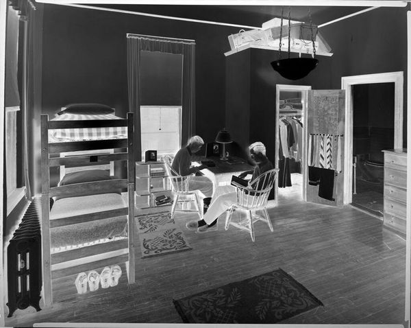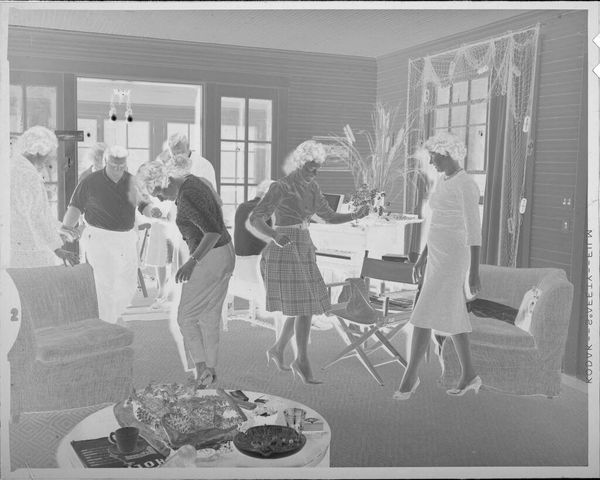 Editor: Here we have "Untitled (women at typewriters)," a photograph of modest dimensions by Lucian and Mary Brown. The tonal range is quite striking. What are your initial impressions? Curator: The strong horizontal lines—the blinds, the desks, even the composition of the typewriters—create a sense of rigid order. Notice how the inverted tones emphasize the mechanical forms? Editor: Yes, the machines and architecture seem to dwarf the figures. Could this signify the rise of industrial processes? Curator: Perhaps. But consider the composition itself. The women form a triangle, a stable geometric shape, set against this grid. What does that suggest to you about their role within this system? Editor: That they are integral to it? I see now how the artist contrasts the mechanical with the human element. Curator: Precisely. The image's power lies in this formal tension.
