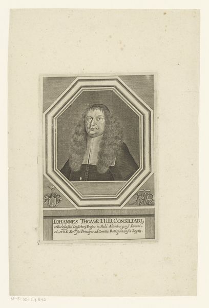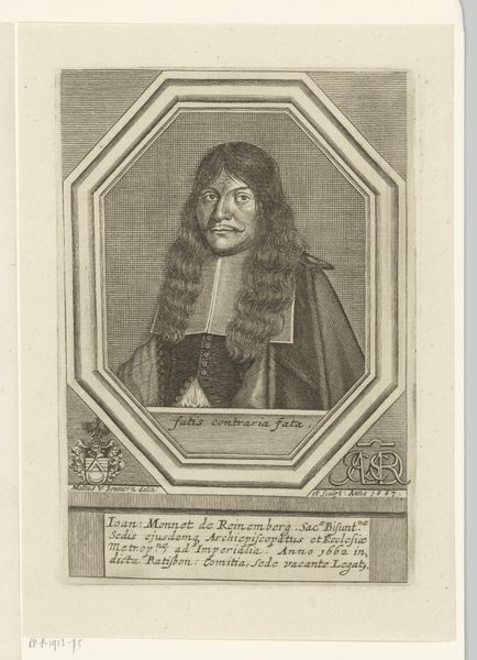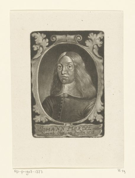 Curator: This engraving, titled "Zelfportret", or "Self-Portrait," was created by Georg Fennitzer, sometime between 1656 and 1722. It is currently held in the collection of the Rijksmuseum. Editor: It strikes me immediately as quite austere. The oval frame seems to contain the sitter, giving the portrait a tight, almost suffocating feel. Curator: It's fascinating how Fennitzer, as both subject and creator, manipulates the printmaking medium. Notice the limited tonal range; the composition relies almost entirely on line work to define form and create depth within that oval constraint. It seems he understood negative space implicitly. Editor: And what might we infer from the fact that this is a self-portrait made available, multiplied via engraving, for public consumption? To me, it indicates something of the artist's social positioning, his attempt to inscribe himself into the historical record of his society and profession. How might the Baroque era conventions—like the flowing hair—have contributed to that agenda? Curator: The looping forms of the hair provide visual interest to what otherwise might be a monotonous shape, creating rhythm in direct counterpoint to the rigidity of his collar. In terms of semiotics, this becomes a potent signifier to read. The wavy lines against the geometric plane function as binary. Editor: One might speculate the binary reflects the tension within the art world, caught between craft and concept? The piece embodies Baroque tendencies but also perhaps subtly challenges the era's art world standards, simultaneously establishing Fennitzer and placing him within reach. Curator: Quite compelling indeed! We often perceive engravings as direct transcriptions of reality, but here, Fennitzer is not merely documenting his image. Instead, through calculated linework, he presents a carefully constructed persona that demands engagement from any serious, discerning viewer. Editor: For me, the lasting impact rests with what it shows about social identity during a critical historical period— and, frankly, the audacity required for such an act of self-commemoration!