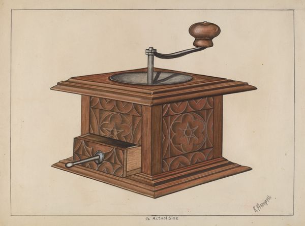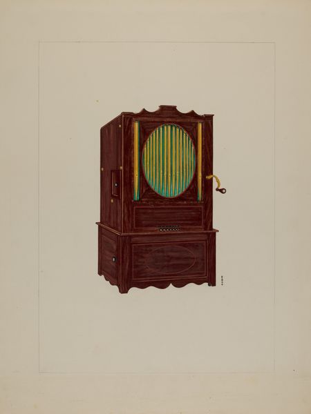 This is Fritz Boehmer's drawing of a Zoar Stove, rendered with graphite and watercolor. What I notice first is the surface, how he’s built up layers to create the illusion of a metallic texture and depth. Boehmer isn’t just showing us a stove, he’s inviting us to consider the objectness of the stove, how it sits in space and interacts with light. There’s a real sense of volume, even though it’s just lines on paper. Look at how the light falls on the cylindrical form of the stove, creating a soft gradient from light to shadow. That dark grey tone, almost like a cloudy sky, gives the stove a kind of weight, a solidity. I think the image is also interesting in relation to folk art. While it's an industrial design drawing, the attention to detail and the almost naive perspective give it a quirky, folksy charm. It reminds me a little bit of some of the Shaker furniture drawings, spare and functional, but also strangely beautiful.