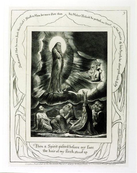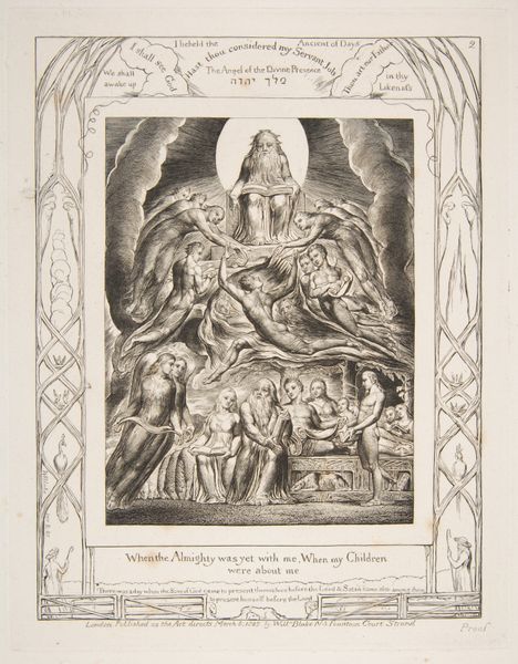 Editor: Here we have William Blake's "The Destruction of Job's Sons," an engraving from 1825-1826. The scene is chaotic, and the figures are so dynamic, even in their demise. What do you see in this piece beyond the immediate drama? Curator: It’s critical to consider Blake's radical vision and his social critique. He wasn't simply illustrating a biblical story; he was interrogating power. Notice how the figures are rendered – muscular, yet caught in a moment of helplessness. How might we interpret this depiction in the context of 19th-century class structures and industrialization? Editor: You mean, beyond the religious story itself, could he be commenting on the vulnerability of people against powerful forces? Curator: Precisely. The destruction can be seen as a metaphor for the oppressive systems that decimate individuals. Blake was deeply critical of the Church and the State. Consider also the figure of Satan in the upper part of the composition. What feelings do you experience in looking at it? Does he look villainous, triumphant or neither? Editor: He doesn't look conventionally evil. He's powerful, yes, but his expression is more…complex, perhaps even tortured? Is Blake questioning the traditional narratives of good and evil here? Curator: Absolutely. Blake often inverted established moral frameworks. Satan, in his works, often embodies a kind of rebellious energy, a defiance against dogma. So, this isn’t just about destruction; it's about questioning the very source of that destruction and, ultimately, resisting oppressive narratives. Editor: That’s fascinating. So, by understanding the social context, we can see the artwork as not only a historical representation but also a radical statement of protest. Thank you! Curator: And by engaging with the complexities within the frame we, too, begin questioning accepted norms. Art can become a real means of political and cultural emancipation.