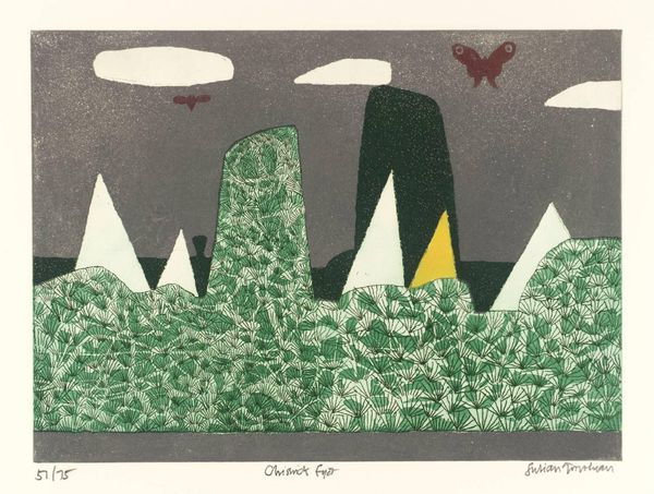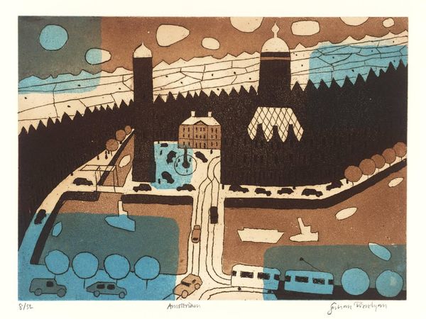 Reijer Stolk made this print called "Alm in Ober-Oesterreich," and it's like a little world captured in lines and colors. The way Stolk uses those bold outlines, boxing in areas of flat color, it reminds me that art is really about choices: what to include, what to leave out, where to draw the line, literally! Look at the mountains in the background – they're not just purple, but a range of purples. It’s like Stolk is saying, “Hey, reality is cool, but my version can be cooler.” The little details, like the people at the picnic tables, give it this homey, accessible feel. It's folksy but also sophisticated. This piece feels like a conversation with other artists who simplify and flatten forms to get to the essence of a thing. Think maybe of someone like Marsden Hartley, who also played with color and landscape in a way that felt both modern and deeply connected to a sense of place. Ultimately, Stolk's print celebrates the joy of seeing and making.
