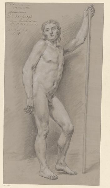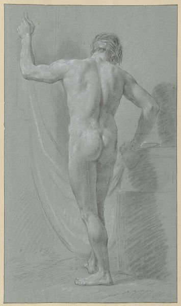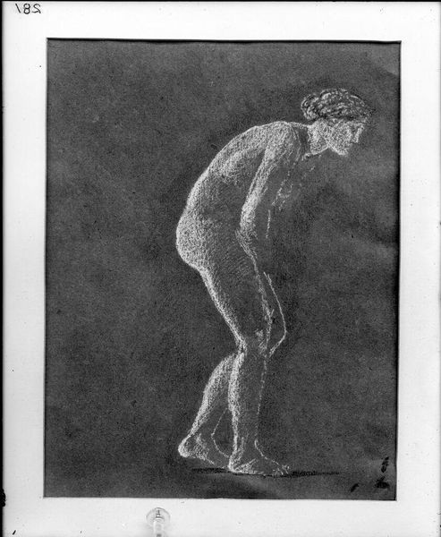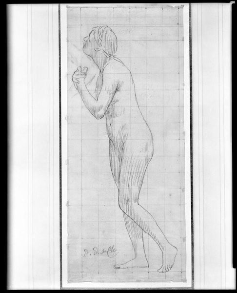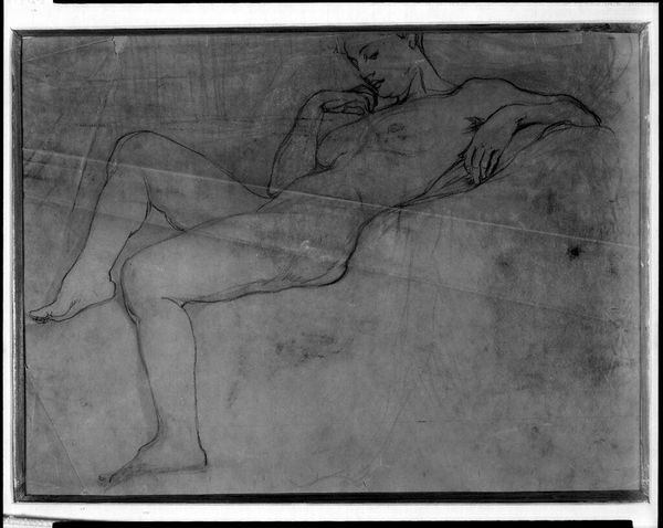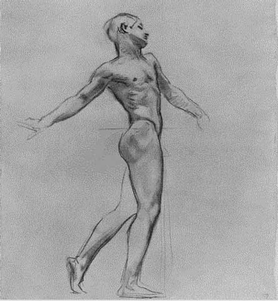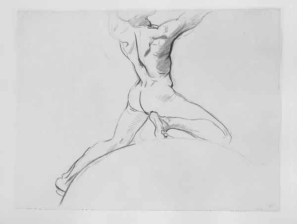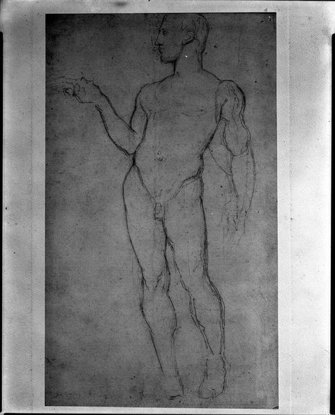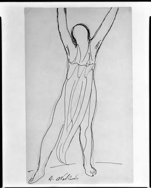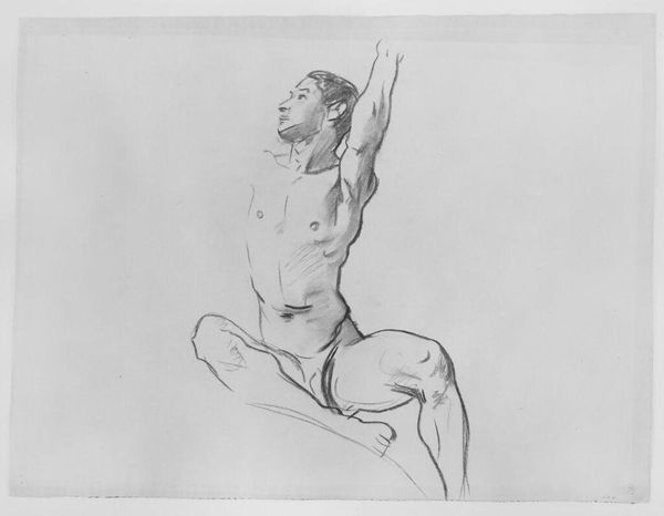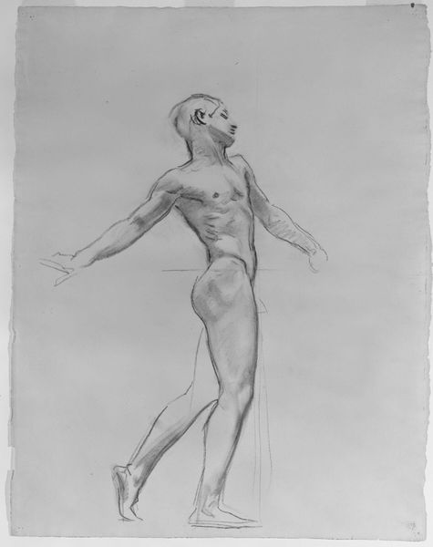 Editor: Here we have Lovis Corinth's "Nude Man with Outstretched Arms," pencil on paper. The figure's pose seems so vulnerable, almost trapped. What can you tell me about this work? Curator: Consider the sociopolitical context of early 20th-century Germany. The male nude, traditionally a symbol of strength, is here rendered with an almost desperate, yielding gesture. Corinth, working amidst rising anxieties, seems to be questioning established ideals. Does the verso, depicting a praying figure, offer a possible interpretation? Editor: So, it's not simply a study of the human form, but a commentary on societal anxieties of the time? Curator: Precisely. Corinth uses the figure to explore themes of power, vulnerability, and perhaps even a yearning for something beyond the material world. Editor: That adds a whole new layer of meaning for me; it's fascinating to think about art as a reflection of its time. Curator: Indeed. It’s through these visual dialogues that we can better understand the complexities of history and human experience.