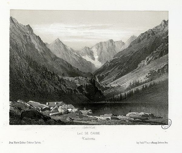 This landscape of Pic du Midi de Bigorre, created by Maxime Lalanne, draws us in with its dramatic composition and delicate lines. Lalanne captures the grandeur of the mountain using lithography. The image is structured around a strong central axis, drawing the eye from the village below to the towering peak. Notice how Lalanne uses light and shadow to create depth and texture. The contrast between the dark, rugged foreground and the luminous mountain in the background adds a sense of scale and drama. The mountains create a semiotic system of signs; their form, enhanced by lithographic techniques, conveys power, permanence, and the sublime. This approach destabilizes traditional landscape art by focusing less on faithful representation and more on the emotional and symbolic impact of the scene. The lithographic technique mirrors a broader artistic move toward exploring how technical processes can alter perception and challenge fixed meanings of what landscape art should represent.