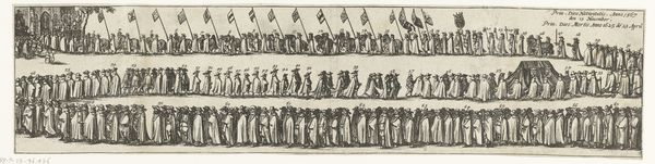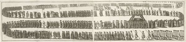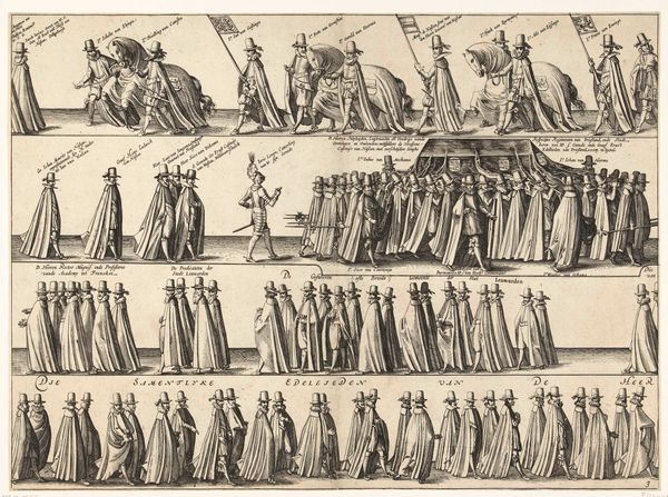 Curator: What a fascinating engraving! Pieter Feddes van Harlingen's "Begrafenis van Willem Lodewijk," created around 1620. The rigid lines portraying so many figures certainly strike me. Editor: Indeed, this print immediately gives off a sense of somber formality with all of its regimented rows of mourners. How do you approach such a piece, focusing on form and structure? Curator: Observe how van Harlingen uses line, a fundamental element here. Note the sheer repetition, creating a rhythm, almost a visual mantra. Consider how the composition is divided into horizontal registers, further emphasizing order and procession. The use of consistent, controlled lines conveys the uniformity and solemnity appropriate for a funerary occasion. Editor: I notice the stark contrast, but limited shading. It gives a very distinct look. How does that lack of tonal range influence the artwork's meaning? Curator: Precisely! This conscious reduction simplifies form and focuses the viewer on the essential contours of each figure. Notice that each person becomes more of a symbol than an individual portrait. The focus is shifted towards a collective identity. A very baroque treatment, don’t you agree? Editor: It is baroque in its theatricality! So you're saying the visual elements, like line and structure, actively contribute to the overall message of order and the gravity of death? Curator: Exactly! Through analyzing the formal elements of van Harlingen’s engraving, we find meaning. Structure echoes purpose. Form conveys feeling. It also prompts us to question the intention behind such a stylized depiction. Editor: That’s really helpful. Thinking about the print through lines, forms, and its composition gives me a richer understanding and appreciation. Curator: Indeed. Analyzing such artworks, beyond the immediate subject, reveals deeper structural meaning and provides critical visual clues.