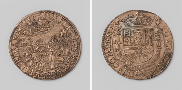 Curator: Here we have a glimpse into Amsterdam's Golden Age: the “Makelaarsgilde van Amsterdam, gildepenning met no. 209,” created in 1612. This intriguing work utilizes metal and engraving. Editor: It has such an archaic charm, doesn't it? The whole piece looks distressed. Curator: Indeed. If you examine it closely, you'll notice the composition. On one side, there's an image of a structure held aloft, supported by rows of pillars. A radiant sun and the watchful angels overlook it. The other side features a heraldic crest, possibly referencing the patron saint or ruling family affiliated with the real estate broker's guild. It seems structurally complete in its use of allegorical devices and emblematic figures. Editor: It definitely does, but my eye is drawn to the actual making. It speaks to the labor and materials involved, the metalworkers' techniques to create these fine details. I wonder, who would have originally handled this coin? Which artisans participated in making it? Did their class matter within their means of production? It evokes a rich tapestry of making art and value creation. Curator: The use of semiotics here provides symbolic capital; for instance, it communicates both practical use-value and symbolic status-value via the shield of arms as heraldic signs that communicate dynastic honor through its use. Editor: Interesting. I'm also pondering the environmental costs, extraction, and transformation needed to give these metal resources their shapes. Thinking critically about consumption encourages a different angle that touches a collective economy during this era. Curator: I am appreciating the symmetry achieved, despite the age of the artifact. Overall, I find the symbolic imagery truly captures the power dynamics of the age. Editor: Absolutely. Its intricate making illuminates various threads such as economics, artistry, class divisions, labor practices and history. I am left musing on the historical dimensions, the unseen participants, their artistry reflected forever more.