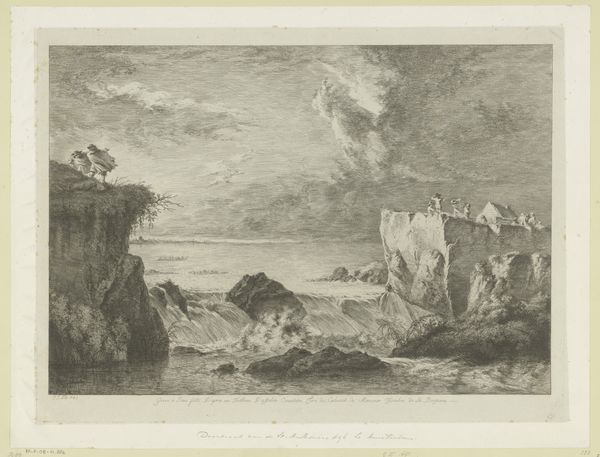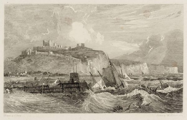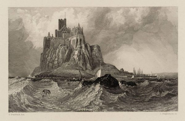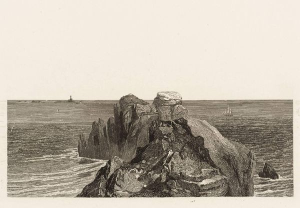 Curator: This engraving, "Land's End, Cornwall," is based on a work by Clarkson Stanfield, the renowned 19th-century marine painter. The image captures the rugged coastline of Cornwall, engraved by J.W. Kernot. Editor: My first impression is one of isolation, a stark contrast between the solid land and the vast, unknowable sea. There's a real sense of vulnerability evoked by the rocky point. Curator: Absolutely, and it speaks to Britain's complex relationship with its maritime identity, built on exploration and trade, but also on colonial exploitation and the erasure of indigenous cultures. The lighthouse in the distance is a visual shorthand for the narratives of progress. Editor: The lighthouse is an important symbol, also. For centuries, lighthouses have guided sailors and served as beacons of hope. This recalls a reliance on the sea, but also its dangers. Curator: It's a reminder that even at the height of industrial power, humanity is still at the mercy of nature's forces and our own social structures. Editor: That is the tension, isn't it? Nature and society. This small image contains such large and persistent questions.