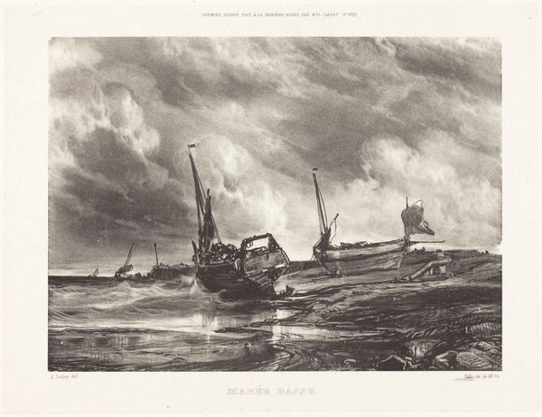Editor: So this is *Strandgezicht*, or 'Beach View,' a print made by Jan Baptist Tetar van Elven in 1848. It feels like there's a lot of drama here; the sky is ominous and the waves seem rough. What do you see in this piece? Curator: The drama certainly comes through! Beyond that, I'm struck by how this image speaks to a sense of human resilience against the raw power of nature. Look at the ships, the way they're grounded yet still upright. Consider their vulnerability, like figures weathering the storms of life. What cultural memories might be embedded in such imagery of seafaring? Editor: I guess it evokes the Dutch relationship with the sea... Like, their dependence on it for trade and fishing, but also the constant threat of floods. Curator: Exactly. The sea is a powerful symbol, representing both opportunity and danger. Notice also how the figures on the beach, rendered with such fine detail for a print, seem to be going about their business, almost indifferent to the dramatic scene unfolding before them. What might that suggest? Editor: Maybe a kind of acceptance? Like they’re used to this kind of weather, it's just another day. It also seems to highlight the insignificance of individuals compared to the ocean’s magnitude. Curator: Precisely. And think about the long tradition, stretching back centuries, of artists using seascapes to explore themes of mortality, the sublime, and the delicate balance between humanity and nature. It’s about more than just depicting a scene; it's about tapping into these shared cultural anxieties and aspirations. What feelings emerge as you ponder its layers of meaning? Editor: Thinking about it that way, the print isn’t just a snapshot of a beach scene; it’s like a meditation on our place in the world. Thanks for pointing out the layers. Curator: My pleasure. Every image is a repository of stories waiting to be told, isn’t it?