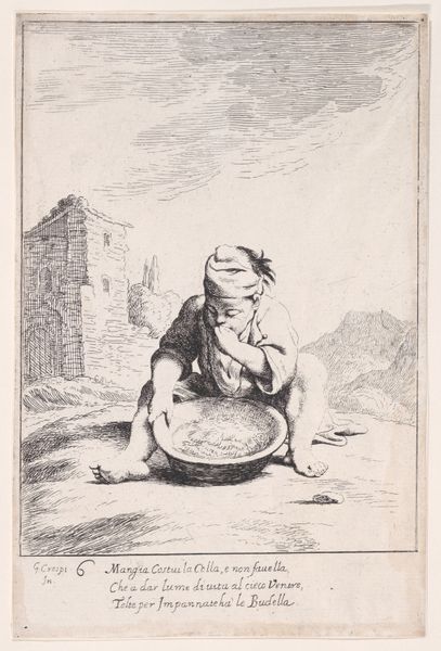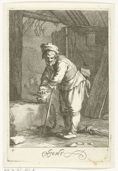 Editor: This is "No. 4: Cook," a print and drawing made in 1799 by Henri Merke, currently housed at the Metropolitan Museum of Art. The figure feels like a stage character—something from a play. What jumps out at you? Curator: It’s fascinating to consider the image as a form of social commentary. Prints like these were often circulated widely, shaping public perception of various trades and social classes. Notice how the cook's wooden leg is emphasized; how might that resonate with viewers in 1799, a period of revolution and naval conflict? Editor: That's interesting. It hadn’t occurred to me to read into the cook's disability. Does it serve to elicit sympathy, or is there a satirical edge at play? Curator: It's likely both. Caricatures in this era often employed exaggeration, and disability could be used to evoke both pity and ridicule. Consider the audience for this print; it would have been consumed within a specific political and cultural context. Also, prints had a didactic purpose for people unable to view the artwork physically, and who consume this image in different spaces? How does the consumption inform the meaning? Editor: So, it’s not just about the individual cook depicted, but also the social narratives and power dynamics surrounding labor and disability in late 18th-century London. The piece asks who gets to consume art and how this consumption impacts cultural significance? Curator: Precisely. The print serves as a portal into a specific moment, revealing how identities were constructed and negotiated in the public sphere. Editor: I now appreciate the role of social history and political context in interpreting seemingly simple genre scenes. It really opens up a whole new avenue for understanding the work. Curator: Absolutely, and it underscores how museums actively shape our understanding of the past. Examining that relationship is critical.