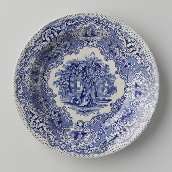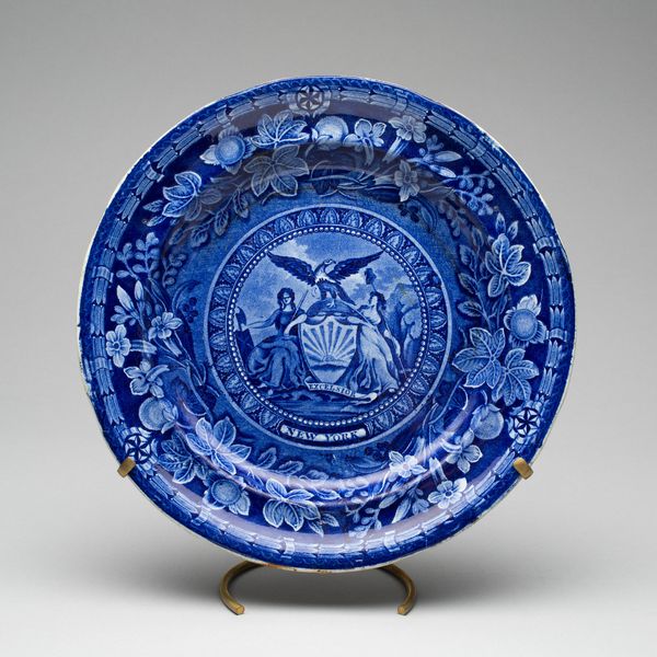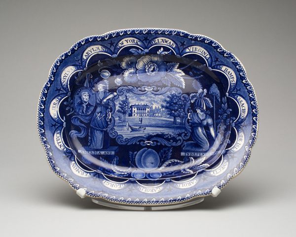Editor: This beautiful blue and white ceramic plate, dating from around 1826 and created by the Staffordshire Potteries, is absolutely covered in imagery! There are portraits and landscapes framed by garlands, and the borders even name the original states. What symbols do you see resonating in this piece? Curator: Immediately, I'm drawn to the allegorical figures framing what seems to be the White House in the central cartouche. They carry so much weight! How are female figures used here to embody ‘America and Independence?' What does it tell us about how national identity was being constructed, even idealized, at the time? And how do these romantic portrayals harmonize, or clash, with the realities of the early republic? Editor: So, it’s about creating an identity, and not just depicting one? The bordering state names become like symbolic guardians almost. Curator: Exactly! Note the fruit, perhaps peaches. What might that suggest? Think about abundance, prosperity, and what the burgeoning nation hoped to offer. Every element contributes to a constructed visual language intended to resonate deeply. But also ask yourself, whose prosperity is depicted, and at what cost? Are all voices represented? Editor: That makes me see how idealized this vision really is, and that even the symbols, when considered more closely, raise interesting questions. Curator: Indeed. Examining the individual components unlocks the layers of cultural meaning embedded within what appears, at first glance, to be a purely decorative object. The image reveals a past through material culture. Editor: I’ll definitely look at decorative arts with a new perspective. I had just seen it as something pretty before! Curator: Which it is, but pretty things often have stories to tell too.