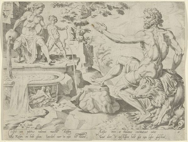 This is a black and white print titled "Dan, from the series The Twelve Patriarchs" made by Maarten van Heemskerck. The piece is dominated by the figure of Dan sitting regally on a throne with a staff in hand. The composition juxtaposes Dan with a chaotic scene of mythical creatures and serpents. The materiality of the print allows for detailed lines and intricate patterns that are characteristic of Renaissance engravings. Heemskerck employs a structured composition to contrast order with chaos. This contrast might suggest a symbolic exploration of power dynamics. The inclusion of classical motifs invites semiotic interpretations, as each element functions as a sign within a larger cultural and philosophical discourse. The print destabilizes fixed meanings by embedding complex narratives within classical forms. The composition invites viewers to question established notions.