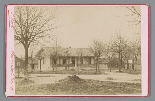 This is a vintage postcard, likely from the early 20th century, by F.J. Vermeulen, titled "Uithoorn, Pastorie." The composition, characterized by its symmetrical balance, is immediately striking. The central focus is a robust two-story building, likely a parsonage, flanked by mature trees on either side, creating a frame that draws the eye inward. The building’s facade is divided into two distinct color blocks, light on the left and dark on the right, adding a layer of structural intrigue that hints at the underlying dialectic of light and shadow, presence and absence. This play is further complicated by the figures within the composition, one on the balcony and another at the entrance, who introduce a human element that disrupts the otherwise rigid symmetry of the structure. The use of color and shading is subtle, almost muted, which evokes a sense of nostalgia and timelessness. The trees, with their thick, leafy canopies, function as both a foreground element and a symbolic barrier, blurring the lines between public and private space. It encapsulates the formal tension between order and chaos, reflecting broader philosophical concerns about how we construct our environments.