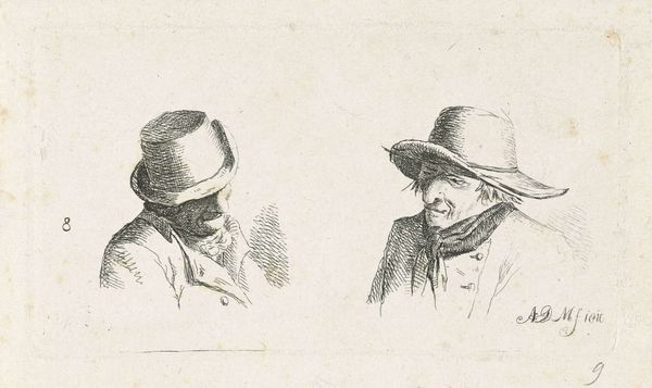 Curator: Here we have a sketch from the Rijksmuseum, “Twee koppen met hoeden,” or “Two Heads with Hats,” created sometime between 1840 and 1880 by Johannes Tavenraat. It's an ink and pencil drawing on paper. Editor: My first impression is that they look like they’re up to something mischievous. Their faces are shadowed under the brims of their hats—a classic conspiratorial vibe, don’t you think? Curator: Perhaps, but consider the hats themselves. They’re practically cages around the wearers' thoughts, hatched with such density that it makes me wonder what these characters are hiding, or perhaps, protecting. Editor: Or are the hats a mark of belonging? A shared symbol amongst a certain group or profession? Hats often served as signifiers. Think of the Mad Hatter, the different color hats in literature which represent varied points of view. Curator: Exactly. The way Tavenraat renders them—these hatched lines—suggests both social coding and psychological complexity. The faces are almost caricatures, with the play of light and dark accentuating their features. The artist seems less interested in objective representation, and more fascinated by suggestion. Editor: There’s an intentional roughness in the lines, isn't there? The kind you often find when the artist is merely recording an idea, as in a personal sketchbook. It isn't smoothed over to create perfect resemblance, but captures a specific impression of how the figures look, and perhaps a subtle understanding of who they are. It feels wonderfully immediate. Curator: That immediacy pulls us into a sort of empathetic understanding. These figures are not polished portraits, but rather quick glimpses of souls that seem both familiar and strange. It is a testament to Tavenraat's sharp observations and rendering style that so much feeling can be expressed with so few strokes. Editor: Agreed. These faces resonate beyond their surface appearance; these are types, icons of their era and perhaps of human nature itself. The piece as a whole creates a vignette rather than a detailed study, yet we still sense that there is a greater world behind these faces.