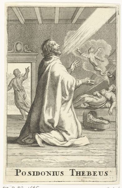 Johann Sadeler the First created this engraving, *Heilige Hyacinthus aanbidt Maria met het Christuskind*, which translates to Saint Hyacinth Adoring Mary with the Christ Child, sometime between 1560 and 1600. Here, Sadeler is drawing on Counter-Reformation ideas, which emphasized the importance of saints, like Hyacinth of Poland, as intermediaries to God and vehicles of miraculous deeds. Look at Hyacinth’s humble posture; he kneels before Mary and the infant Christ, who sit on a cloud. The text above confirms that Hyacinth’s prayers are heard by God. This image promotes the idea that prayer and devotion to the saints can lead to divine intervention and salvation, central tenets of the Catholic Church at this time. To understand images such as this, one might look to historical records of religious practices, theological texts, and biographies of saints. In doing so, we gain insight into the artwork’s original meaning and its role in shaping religious beliefs and practices of the time.