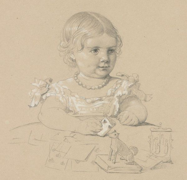 Pierre-Auguste Renoir made this drawing of Claude Renoir, head bowed, using what looks like charcoal or maybe conté crayon. What's interesting to me is how soft and almost blurry the marks are, but they create a definite little person! See how the shading around the head and hair kind of melts into the background? It's not about hard lines here; it's about the feeling of form, the shadows doing the work. Even the little flower in the child's hair is just a suggestion, a smudge of light. And the way he captures the downturned gaze and pursed lip – you feel the mood, right? Renoir, known for his Impressionist paintings full of light and color, shows us something different here. It makes me think of Degas' drawings, that same focus on capturing a moment, a gesture, with incredible economy. It's a reminder that art isn't always about perfection; it's about the magic of suggestion, and maybe a little bit of mystery.