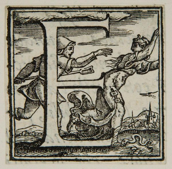 Curator: Isn't it fascinating how even the alphabet can be a canvas? This anonymous print, titled "Letter F", uses line work to depict an ornate scene. Editor: My first thought? A rather wild fever dream! The centaur especially—are those musical instruments or weapons he's juggling? Curator: Precisely. The centaur might represent Sagittarius, a connection between intellect and instinct. The wild man lurking behind the letter—perhaps an embodiment of primal nature? Editor: So, the letter "F" becomes a stage for the dance between civilization and chaos? I like how the rigid lines of the letter itself contrast with the fluid forms of the mythical creatures. Curator: And consider how the print, likely part of a larger alphabet series, inserts narrative and meaning into what we often see as a purely functional form. Editor: It’s like the artist is hinting at the stories hidden within the building blocks of language itself. A single letter suddenly feels so potent, so charged with possibility.