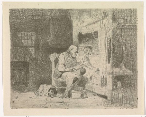 Editor: So, this is "Old Man Reading to His Wife" by Petrus Marius Molijn, sometime between 1829 and 1849. It's a delicate watercolor on toned paper, and there's a real sense of quiet intimacy to the scene. What stands out to you when you look at this drawing? Curator: I am immediately drawn to the interplay of light and shadow and what it tells us about this space, both physically and emotionally. Light, traditionally, symbolizes knowledge, clarity, revelation. Notice how it illuminates the book the man is reading, and softly caresses the wife in bed. Does it imply an act of teaching, of comforting through shared narrative? Editor: That's interesting. I hadn't thought about the directionality of the light as narrative. Curator: And consider the figures surrounding the couple - a dog, lying peacefully at the man's feet. Dogs have been potent symbols of fidelity, loyalty, domestic tranquility. How does its presence influence your understanding of the overall message? What values is the artist trying to impart? Editor: It definitely reinforces that feeling of peaceful domesticity. It feels very sentimental, perhaps idealized. Curator: Indeed. What about the rough, sketchy quality of the lines, especially around the edges of the composition? Does this rawness temper any sense of sentimentality, perhaps suggesting a more immediate, honest portrayal of life? Editor: I see what you mean. It does add a layer of reality, like a glimpse into their private world rather than a staged portrait. The unfinished feel makes it more human, somehow. Curator: Precisely! Molijn invites us to reflect on the simple, enduring connections between people, enriched by the everyday rituals of care and companionship. And the symbols reinforce these central themes. Editor: This has really changed how I see the drawing. It's not just a sweet scene; it’s layered with meaning. Thank you!