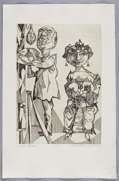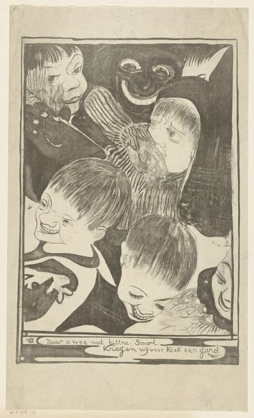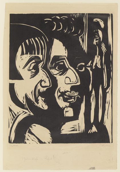 Curator: Ernst Ludwig Kirchner’s woodcut, “Kinderporträt K-H. – Zwei Knaben (Köhler-Haußen),” made in 1908, depicts two young boys. Editor: The bold black and white contrast immediately strikes me; it’s almost unsettling, lending a starkness to the children’s faces. Curator: Kirchner, a key figure in German Expressionism, frequently explored themes of alienation and societal tension, which is particularly relevant in this historical period marked by significant industrial and social changes. Consider also that he was exploring new printing techniques here, the impact on labor for artists to create more prints… Editor: That raw quality seems intentional given its themes; it emphasizes the internal states of the children, maybe a questioning or loss of innocence reflecting broader anxieties of the time, beyond purely formal portraiture. This work really underscores the burgeoning expressionist movement’s departure from traditional academic representation, doesn’t it? The composition and the carving marks have a strong influence here. Curator: Absolutely, we see that focus shift here towards subjective emotional experience, heightened by his deliberate use of the woodcut medium. The sharp lines and stark contrast not only convey emotion but reflect a broader trend among artists questioning traditional art-making processes as these print methods allow for mass reproduction and broader impact across audiences. What do you think about its setting, and place within museums? Editor: Well, its place here highlights art’s complex relationship with institutions. Expressionism initially faced resistance; now its place is enshrined in the modern canon. The art world can seem ironic as works that were initially transgressive or shocking eventually find their place on museum walls, in that process almost neutering that initial shock! The work asks how socio-political events, how changes to social order affected individual artists such as Kirchner. Curator: Precisely. And its original purpose – was it intended for commercial reproduction, personal expression, or both? These considerations underscore the complexities surrounding art’s role in society. Editor: Examining such art prompts questions about cultural values, individual expression, and the power structures at play in art production and consumption. It helps challenge our notions about what art does. Curator: Indeed, seeing this today is not just an encounter with form but with historical context and lasting influence across society. Editor: And that stark effect Kirchner has achieved in this work, I suspect it will stick with me a long while after our conversation, as it seems particularly pertinent today as then.