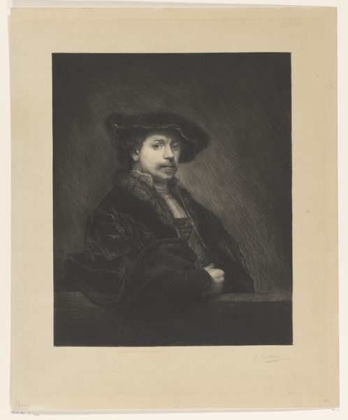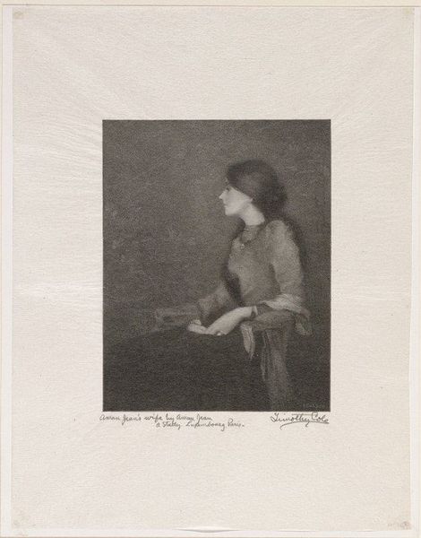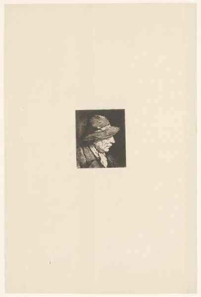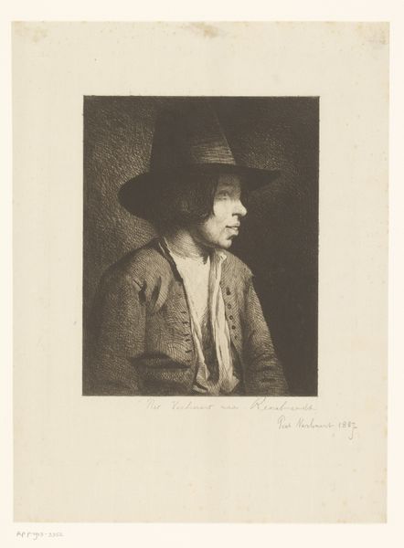 Henri De Graer created this print, "Vrouw bij een wastobbe," using etching techniques. The image, dominated by a monochromatic palette, emphasizes a stark contrast between light and shadow, drawing our eyes immediately to the woman's face. The composition divides the scene vertically, with the dark, undefined background pressing against the figure. The woman's gaze, directed slightly upwards, introduces a sense of introspection. De Graer disrupts traditional portraiture with his candid depiction of labor. The rough texture of the etching enhances the raw, unidealized portrayal, challenging conventional notions of beauty and worthiness in art. The print's visual construction invites us to consider the semiotics of labor and representation. De Graer engages with a broader cultural discourse on the visibility and value of working-class women in late 19th-century society.