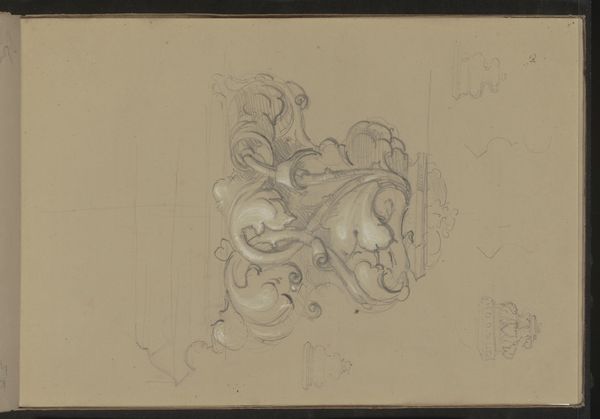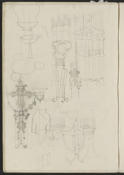 This is a study sheet by Pierre Joseph Hubert Cuypers, rendered in pencil. The composition is a field of studies, each carefully considered yet informally arranged. The drawing includes sketches of a chalice and other ornamental designs, showcasing Cuypers’s interest in ecclesiastical art. The chalice stands out as a central motif, its form rendered with precise lines to convey a sense of depth and detail. The composition is arranged to draw the eye around the sheet, inviting a close look at the individual elements and their interrelation. The artist explores the chalice’s form from the base to the ornate lid, capturing its elegant shape and intricate details. Cuypers' formal approach provides insight into his design process. He emphasizes the interplay between architectural structure and ornamental richness, reflecting broader philosophical ideas about design. This sheet is not only a study of forms but also an investigation into the symbolic language embedded within religious objects. Through these designs, Cuypers shows how aesthetic forms can be vehicles for conveying cultural and spiritual meanings.