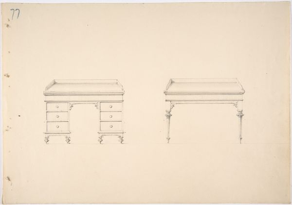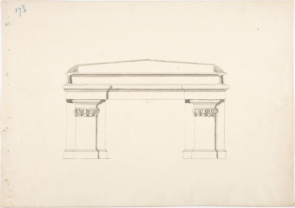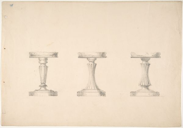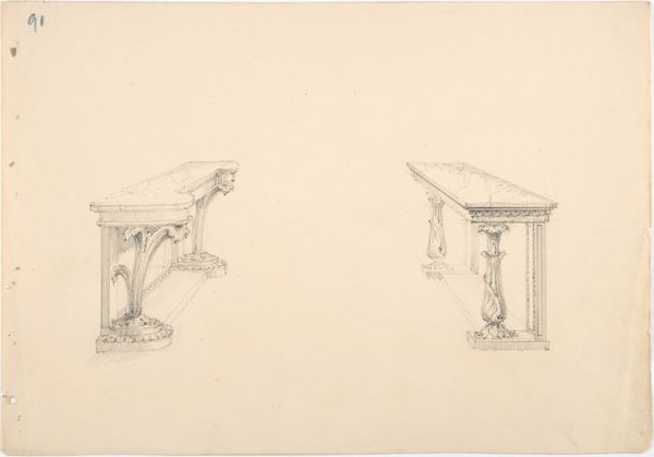 Curator: The drawing before us, simply titled "Design for a Small Gothic Pedestal Table and Two Brackets," was created anonymously sometime between 1800 and 1850. It employs pencil and print medium and is part of the decorative art collection at the Metropolitan Museum of Art. What’s your initial response to this rendering? Editor: It looks so fragile. The lightness of the pencil gives the proposed table and brackets an ethereal, almost impossible quality. It seems to hover on the page rather than exist as solid, grounded furniture. Curator: Indeed. The Gothic style's revival during the Romantic era reflects a fascination with history and the craftsmanship of the past, often idealizing the Middle Ages as a period of intense spiritual and aesthetic values, especially among elite circles and landed gentry searching for authenticity in design. Editor: It’s intriguing how the artist used the graphic qualities of line to emulate material density and structural form. It makes you consider the labor and craftsmanship involved in even designing a simple table and supporting features. What was this meant to become? Curator: The design would likely have been intended for a wealthy patron looking to furnish their home in the fashionable Gothic Revival style. These weren't just tables and brackets; they were statements about the owner's taste, education, and social standing, all underpinned by economic structures. The gothic architectural movement spoke of hierarchy. Editor: I agree. Thinking about who was employed in constructing such decorative objects, the access to craft, the distribution channels: these tell us so much about the economic realities, class tensions, and material culture of the period, revealing complex relations between the artisan, the patron, and the broader public. Who makes these now? Curator: And beyond that, where do we see remnants of these objects’ influences on gender roles and constructions of domestic life from this period? It evokes reflections on class and design theory. Editor: Exactly. This humble sketch unpacks volumes.