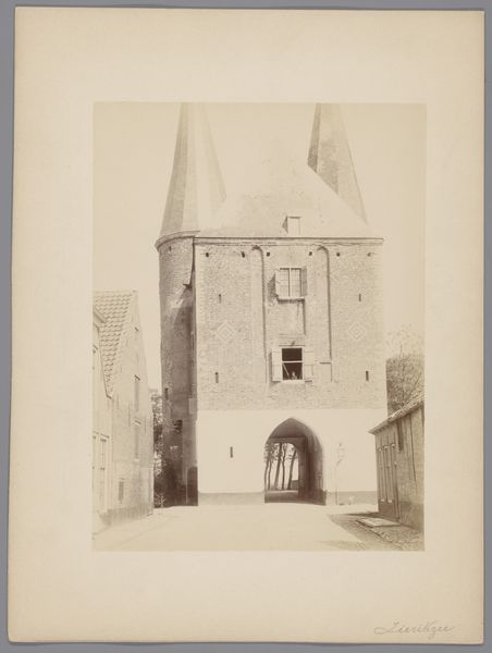 Lodewijk Hendrikus Serré made this albumen print of Veerpoort in Schoonhoven in the Netherlands during the late 19th century. The photograph depicts a quiet street leading to a stone gate, framed by typical Dutch buildings. The scene offers us a glimpse into the placid, everyday life of the time, but it also shows the physical imprint of Dutch history. The gate itself, a relic of a bygone era of fortifications, would have been a reminder of the town's past struggles and defenses. It offers a material document of the Netherlands’ complex relationship with the land and with its neighbors. The dog in the foreground almost acts as a mediator between past and present, or between the public and private. Understanding such an image requires not just an appreciation of its aesthetic qualities, but also an investigation into archives and historical records to fully understand the cultural values it embodies. This helps us consider how ideas about nationhood and community were shaped and expressed through art.