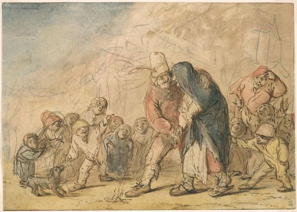 Curator: Honoré Daumier’s "Defense Attorney," created around 1865, employs ink, watercolor and charcoal to capture a courtroom scene, currently residing in a Private Collection. What are your first impressions? Editor: Chaotic. The scene feels crowded, claustrophobic even, and there's a clear emotional intensity radiating from the central figures. The color palette is subdued, which amplifies the drama rather than diminishes it. Curator: It's interesting you say that, because Daumier was deeply invested in documenting the lived experiences of the working class during the Second Empire. His choice of materials - ink wash and charcoal - are incredibly accessible. We aren't talking about oil on canvas; Daumier used what was at hand to depict a raw reality. This speaks volumes about who he was trying to reach with his art. Editor: True, the materials underscore the gritty reality, but consider how Daumier manipulates light and shadow. Notice how he directs our gaze by highlighting the faces, particularly that of the impassioned defense attorney? The composition itself argues a point. There’s definitely a statement about social justice encoded within the formal elements. Curator: I agree, but what kind of labor went into this image? These lawyers and their clients were often embroiled in exploitative legal systems. I see the artist wrestling with those same societal inequities via his quick sketch, his cheap paper, his fluid but dark marks... the materials were available, but the skill was hard-won, it isn't incidental that this specific grouping of people have power in their courtroom scenario, Daumier understood labor at the intersection of societal hierarchy. Editor: But Daumier isn’t merely documenting labor, is he? He's actively shaping our perception through design, by the conscious exaggeration of facial features, which becomes a study of expression. The turn of a head, the furrow of a brow, the subtle hand gestures… these are formal elements creating and enhancing the feeling of raw urgency in that particular courtroom setting. Curator: And it does both simultaneously, creating artwork to move and relate with at varied social spheres and echelons, showing the same people who are enmeshed within corrupt systems, making choices of style, composition, and tone. This isn't accidental! Editor: I see your point, reflecting on his technical prowess and social consciousness enriches my reading of the work.