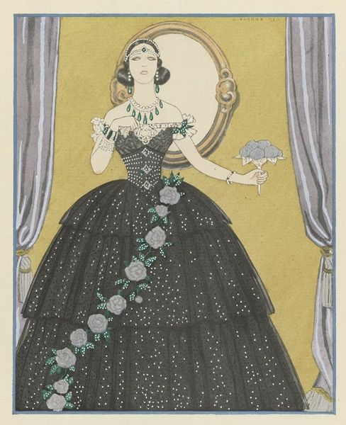 Curator: Look at the delicate linework and vibrant colours of this drawing by Léon Bakst. It’s titled "Narcisse" - Nymph Echo, created in 1911. Bakst was known for his costume and set designs for the Ballets Russes. Editor: My first impression is one of theatrical melancholy. The figure's pose and flowing robe create a sense of graceful sadness, heightened by her pale, almost vacant, facial features. I’m drawn to the textures created by ink on paper. Curator: Costume design was integral to conveying character and narrative for the Ballets Russes. Here, the detailed rendering of the nymph's gown—all swirling blues and delicate embellishments—speak to Bakst’s meticulous artistry and how fashion became performative art on stage. But, importantly, remember the public controversies connected with the production. Editor: Absolutely. Let's not forget the historical context. Ballet Russes shows, though dazzling, faced criticism. They promoted exoticism and stereotypes, potentially shaping problematic perceptions of race and gender. How do we reconcile the aesthetic beauty with these critical, sociopolitical points? Curator: Precisely! Understanding art means confronting the difficult aspects. It asks us to consider the ballet's relationship to the orientalizing gaze and how those biases informed both its reception and production. How can we critically celebrate Bakst's artistry while still challenging the ballet’s colonial undertones? Editor: Exactly. By looking closer. Those glittering details almost obscure how the artist seemed to deliberately dehumanize the figure of Echo—a being who already, according to myth, faces a certain amount of dehumanization as the being can only repeat. It leaves me wondering about the power dynamics and whether Bakst consciously used the image to explore ideas about voicelessness and agency through costume. Curator: Ultimately, approaching this work responsibly demands engaging in this critical analysis, prompting questions about the portrayal of marginalised groups in art and performance and also more about the cultural landscape in which ballet participated and operated. Editor: Definitely food for thought. Seeing this artwork alongside those complexities really amplifies our awareness about art and social critique.