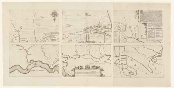 Curator: Looking at "Kaart van Zeeland, bestaande uit negen delen," dating roughly from 1655 to 1725, in the Rijksmuseum collection, what strikes you first? Editor: It’s incredibly detailed! A set of what looks like nine map tiles forming the province of Zeeland. All these finely etched lines must have taken ages to produce. You can almost feel the patience of the craftsman. Curator: Exactly. Each panel, created as an engraving, would have been printed and perhaps sold individually. We need to consider the economic drivers for creating and disseminating such cartography during the Dutch Golden Age. Who was buying these? Editor: Wealthy merchants, navigators… people directly involved in maritime trade, I'd imagine. Having access to accurate maps held practical and symbolic power. Beyond mere geographical details, consider the artistry embedded in representing territory and maritime authority. Curator: True. But, how do the materials – the paper, ink, and printing press used to create these maps influence our understanding? Were they common? Was there a workshop with multiple artisans involved in creating these sets? Were the engravers paid fairly for the highly specialized labor required? Editor: Those are excellent questions! This map offered detailed geographic data while bolstering national identity and projecting dominance. We need to explore the institutional context: Were there state-sponsored initiatives or private cartography firms at the heart of this project? The political stakes were certainly palpable. Curator: Yes, by examining the economic investment in materials and labor we see more clearly that these maps played an important part in supporting the Netherlands's maritime power during that period. These images show the real engine of industry. Editor: I agree, studying these maps helps us understand how social, cultural, and artistic aspects reflect broader changes and values in Dutch history. Curator: For me, examining these maps with attention to the work and economics involved in map production underscores their true nature. Editor: For me, the key is grasping Zeeland's context within larger systems of knowledge production.