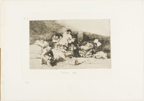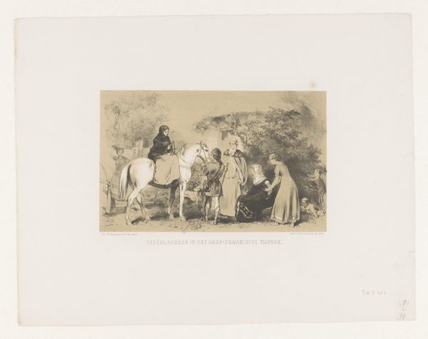 Curator: This engraving by Charles Rochussen, called "Muzikanten," which translates to "Musicians," dating from before 1864 and residing here at the Rijksmuseum, presents an interesting tableau. The figures appear to be performing, yet there's a palpable stillness to the scene. Editor: Yes, stillness and something else...a dreaminess. Even though it's just black and white, the soft hatching makes it seem like we're observing figures in a very distant past through a slightly foggy lens. They look medieval but…almost staged? Curator: It's Rocshussen's take on a romanticized medieval scene. I see layers here. On one hand, we have the cultural fascination of 19th-century Romanticism with the pre-modern era. It evokes a particular sentimentality, doesn’t it? The figures are not real but symbols of what that century thought about the distant past. Editor: Exactly. The image constructs a version of the Middle Ages as simpler and more wholesome than 19th-century industrial life. Take the clothing, for example. It speaks more to romantic notions of the Middle Ages rather than a strictly historical approach. Look, each character, instrument, or garment becomes more of a symbol, more like an allegory of Medieval past times. Curator: You’ve noted a crucial point – they function symbolically, expressing a mood more than describing an event. The gathering of musicians beneath a tree speaks to community and a shared cultural experience. It tells more of a romantic sentiment than of what actual medieval musical life may have looked like. Note how, rather than a lively street scene, there's an order and solemnity. Editor: Right. I wonder about the intended audience at the time and the narratives they superimposed upon this imagery. What did an image like this signify amidst the social shifts of the 19th century? Curator: Perhaps an escape or an ideal. Rochussen presents the possibility of collective creativity in what would be seen as a golden age from a contemporary and disillusioned position. The medium also has a role: it is an engraving, something reproducible for the wider public to be accessed more easily, even collected, and enjoyed. Editor: Interesting food for thought... It seems Rochussen wasn’t simply showing us musicians but whispering about the relationship between history, nostalgia, and artistic representation itself. Curator: A harmonious way to end our reflection. Thank you.