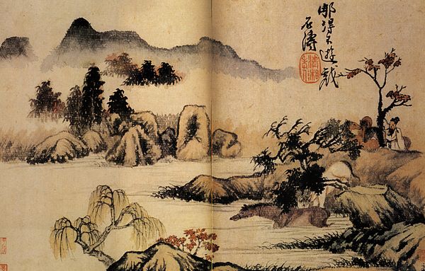 This landscape painting was created by Qiu Ying during the Ming Dynasty. It presents a classical vision of nature, deeply rooted in the cultural and philosophical values of its time. Qiu Ying, born into a modest background, navigated a society structured by rigid class distinctions, eventually rising to prominence through his artistic skill. His landscapes often evoke a sense of yearning for harmony, a theme that resonates with the social and political upheavals of the Ming Dynasty. The mountains, trees, and figures are meticulously rendered, inviting viewers to reflect on the relationship between the individual and the vastness of the natural world. There is a palpable tension between the desire to escape into nature and the recognition of human presence within it. The artwork presents a space for contemplation, mirroring the artist’s engagement with his own identity and the broader cultural narratives of his era. It offers a serene, yet complex view of the world, steeped in both personal expression and shared cultural understanding.
